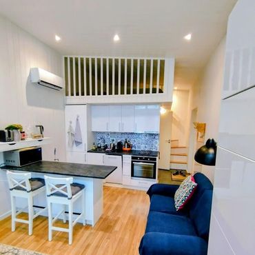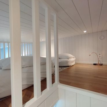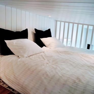 Vi har två studiohus på 30 kvm vardera, med ett tillhörande loft som mäter 10 kvm. Husen är lämpliga för två gäster, men rymmer upp till två extra gäster.