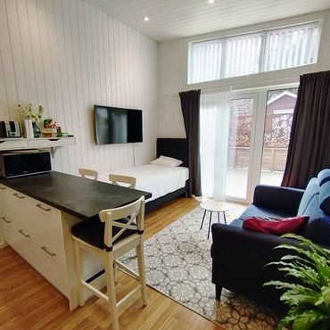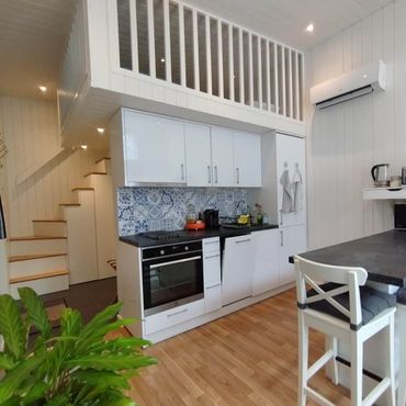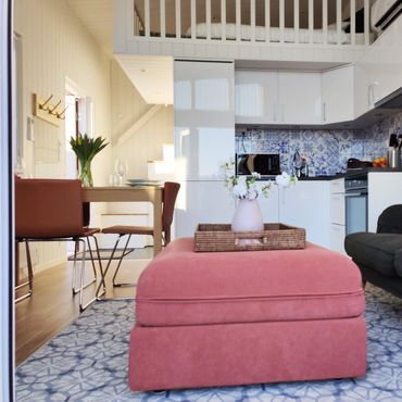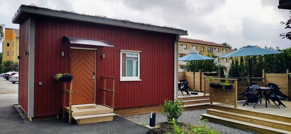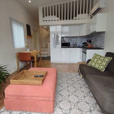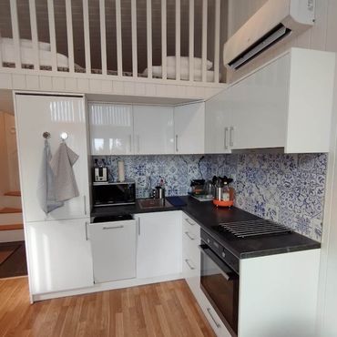 Vårt första studiohus är på 25 kvm, med ett tillhörande loft som mäter 8 kvm. Huset rymmer upp till tre gäster.